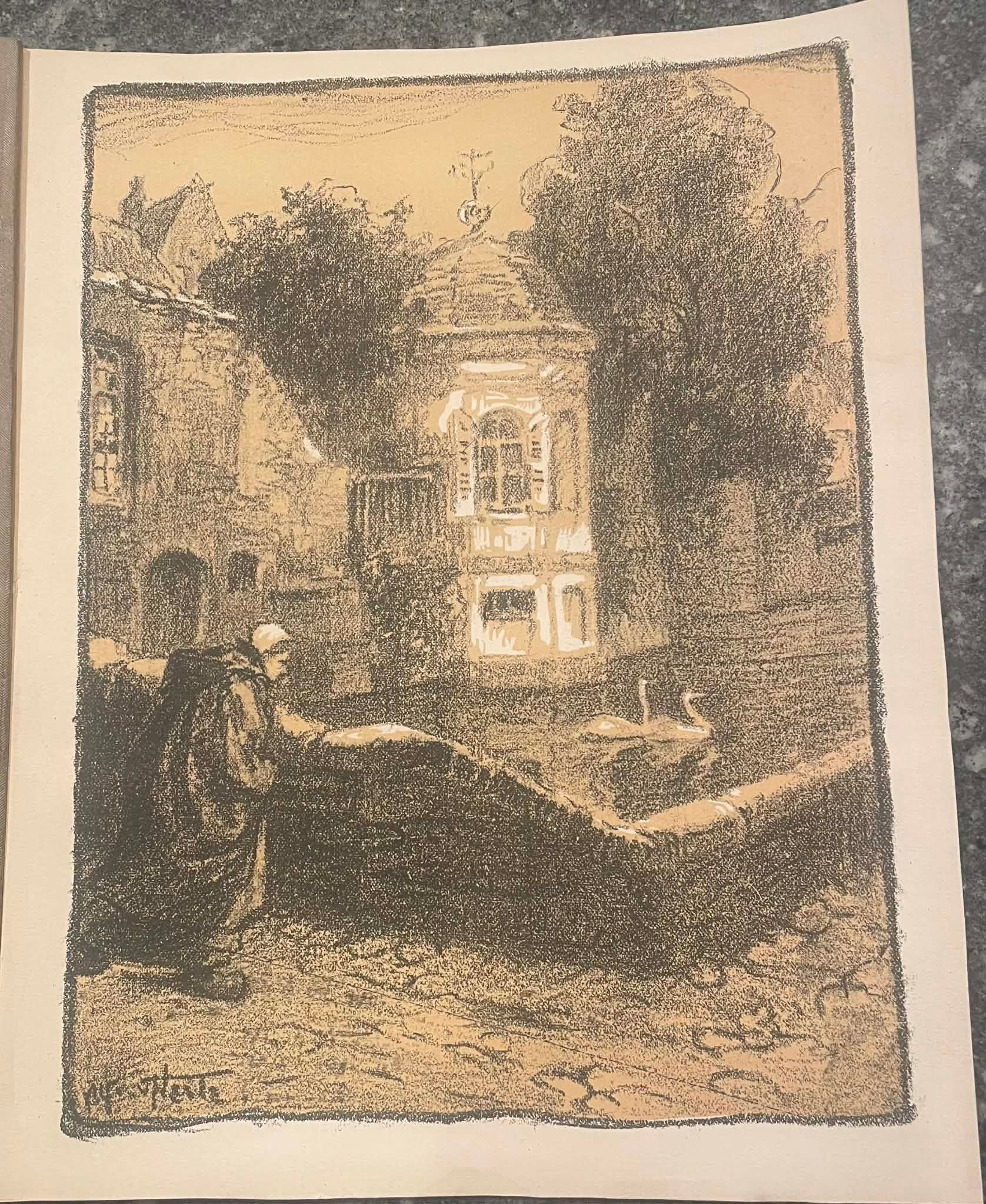 Hij is vooral gekend om zijn etsen en lithos. Deze litho verscheen in het "musée du livre" van 1917. Het is het witte paviljoen langs de Groene Rei.